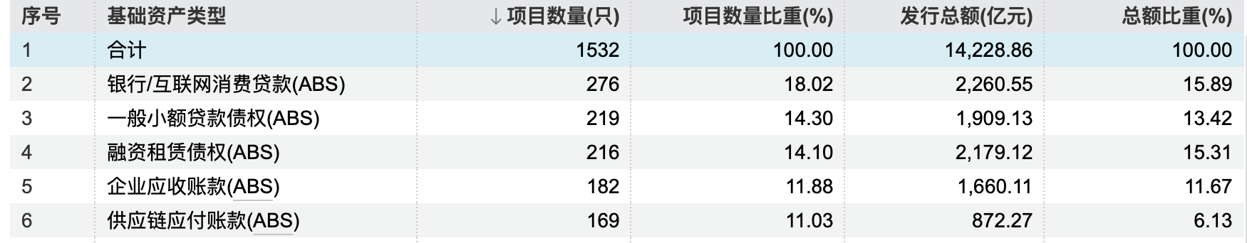 图源:Wind在27个ABS发行品类中,银行/互联网消费贷款ABS的发行数量与发行总额均位居第一,占比分别为18.02%、15.89%。